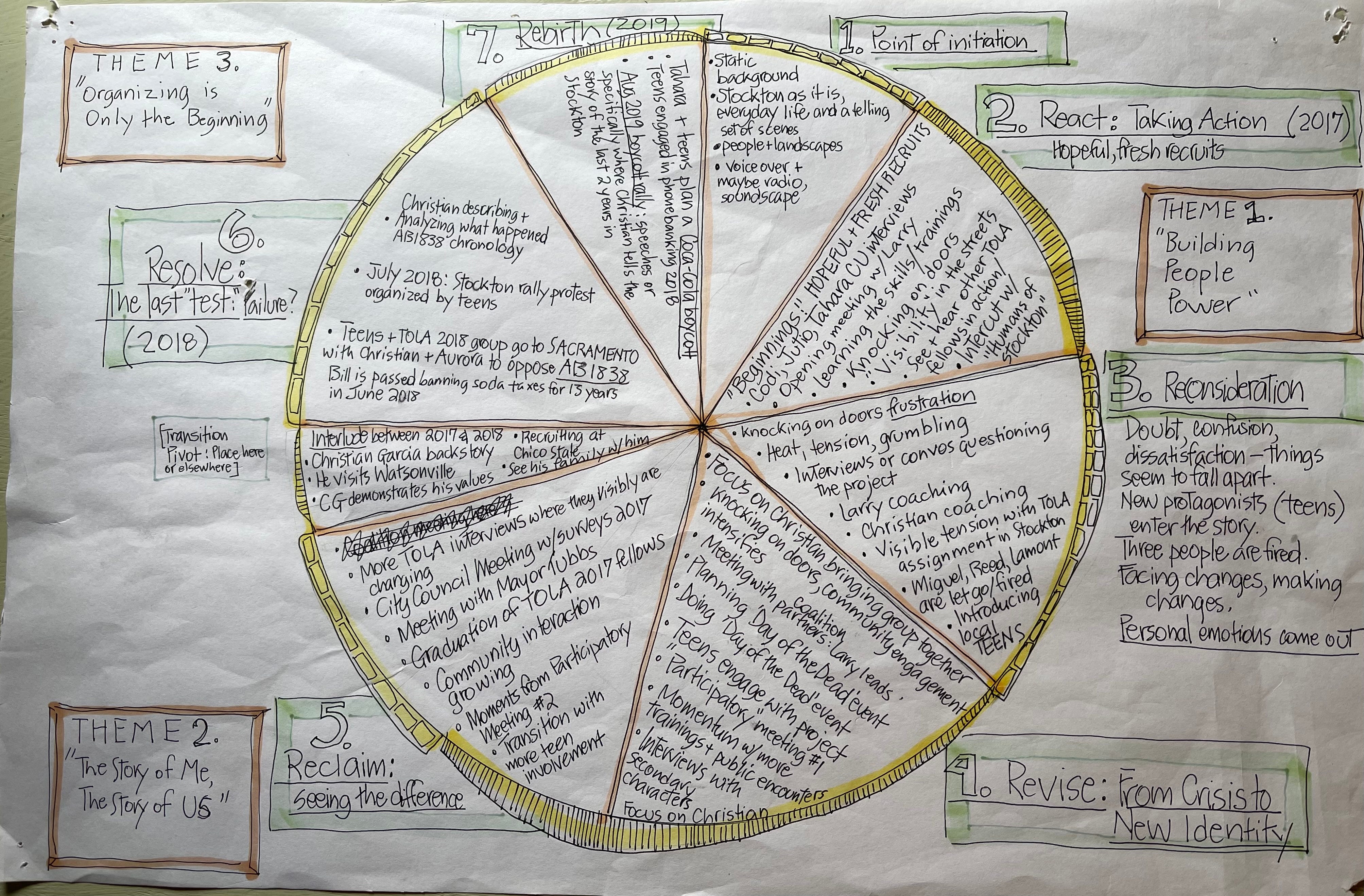 I work alone at this phase to discover the big picture structure and commit to it. I move through and among shots and longer scenes that spark my interest, gathering them in a organized folders, and then sketching out my paper-based Big Map of the story elements. Three interwoven themes emerged organically for this project: Building People Power reveals the grassroots momentum; The Story of Me, The Story of Us captures individual transformation within collective action; and Organizing is Just the Beginning traces the ripple effects beyond the campaign.
